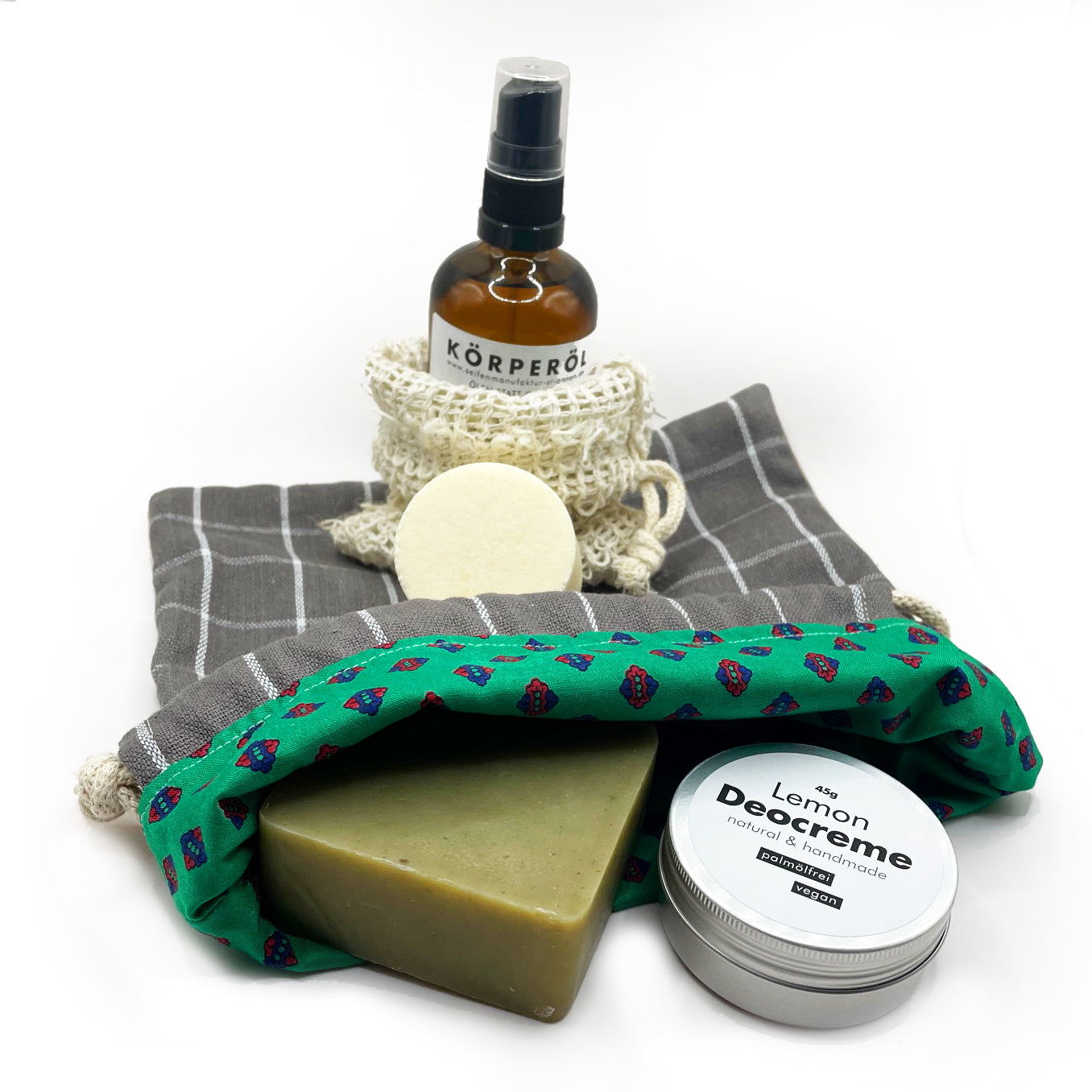 n unserem Seifensäckchen-Set für unterwegs findest du alles, was mann so braucht. Als erstes ist da die Herrenseife zum Duschen, dann das feste Shampoo zur Haarpflege, das Körperöl plus Seifensäckchen zur Pflege für den ganzen Körper und unsere Deocreme Lemon. Alle Produkte sind mit wertvollen Bioölen liebevoll von uns per Hand für dich gefertigt und finden spielend in dem schönen Recycle-Seifensäckchen Platz.